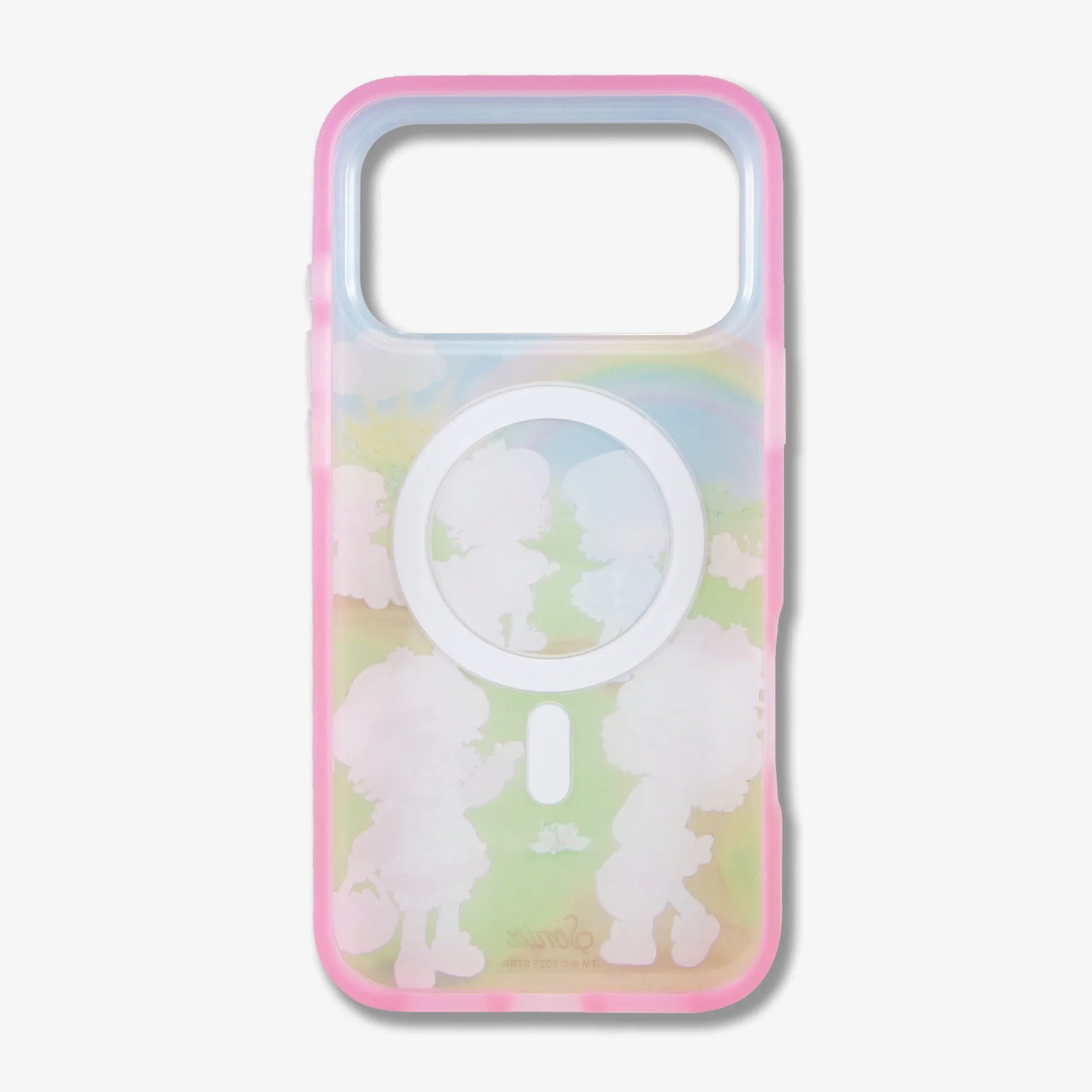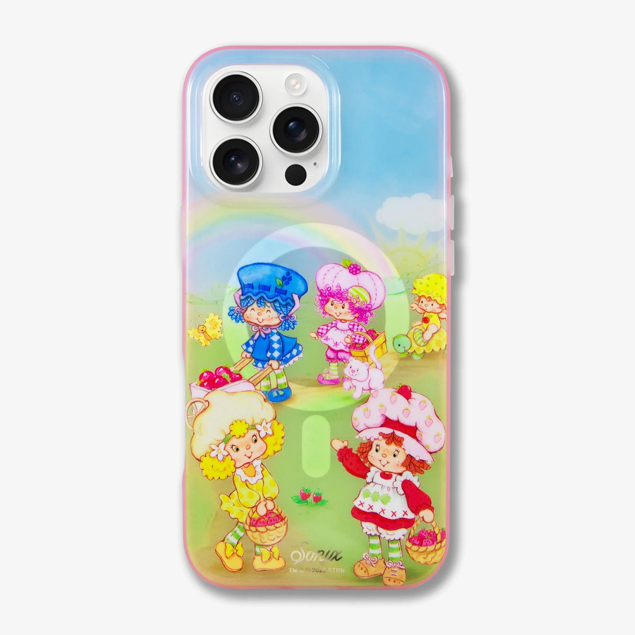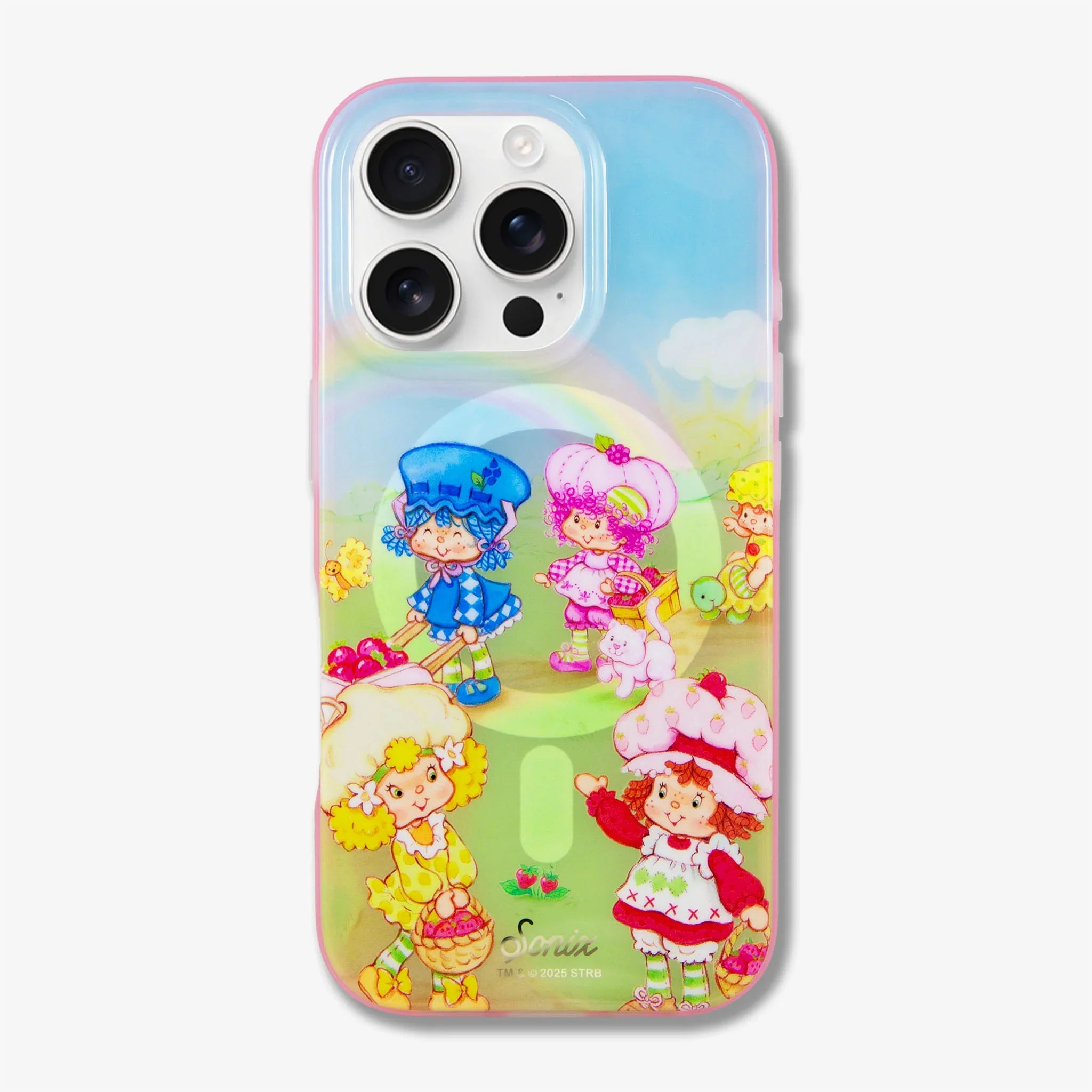 Bring a burst of vibrant nostalgia and charm to your new phone with the Strawberry Shortcake™ Berry Besties Rainbow MagSafe® Compatible iPhone Case. Featuring a delightful scene of Strawberry Shortcake™ and her Berry Besties—Lemon Meringue, Blueberry Muffin, and friends—set against a vibrant rainbow, sunny sky, and lush green field, this case captures the classic 1980s cartoon magic. A sweet pink flexible bumper offers robust protection against scratches and drops, with precise cutouts for all ports, buttons, and cameras. Designed to be MagSafe® compatible, it ensures seamless wireless charging while maintaining a slim, comfortable grip. Perfect for fans of the beloved classic Strawberry Shortcake™ characters, this case blends iconic style with modern functionality.