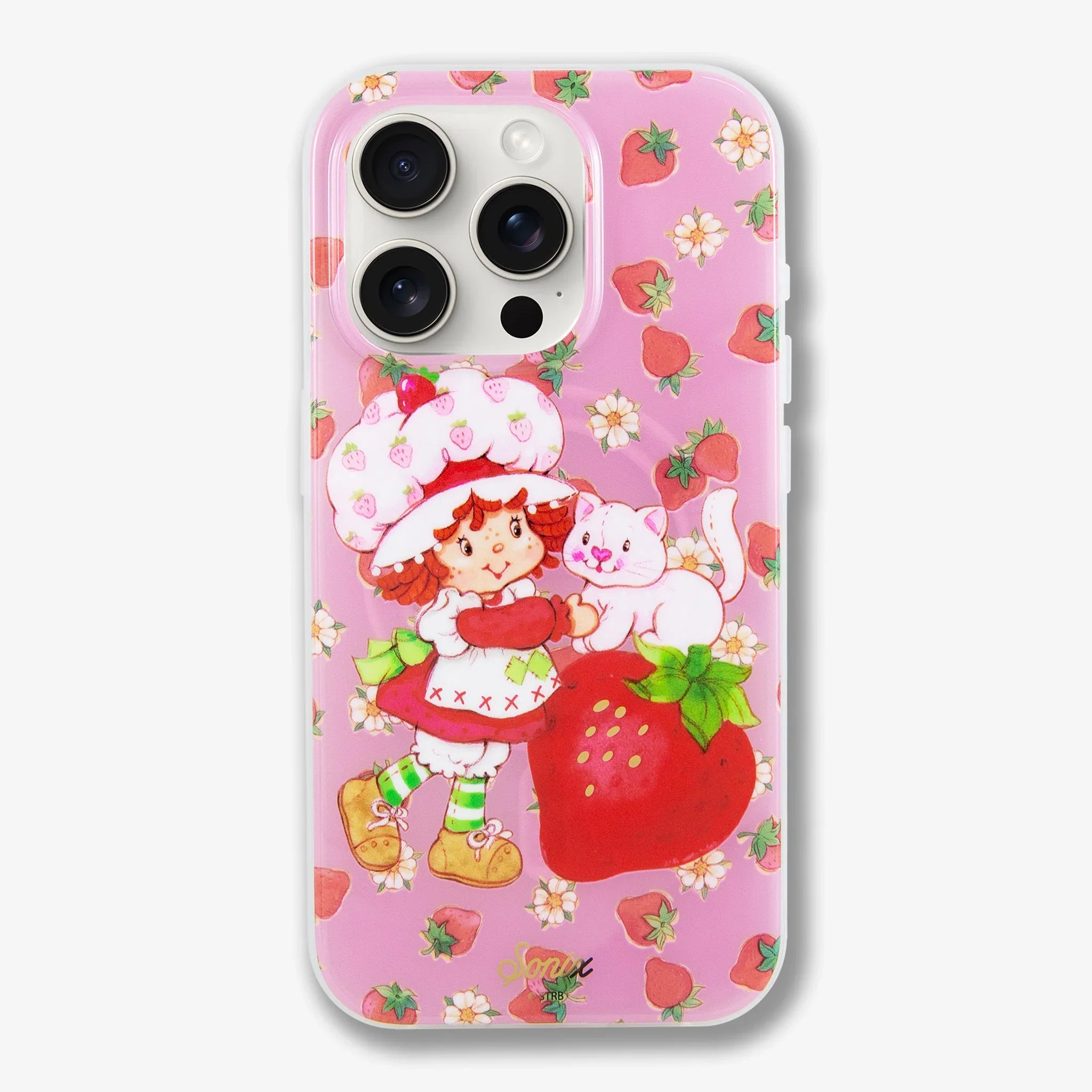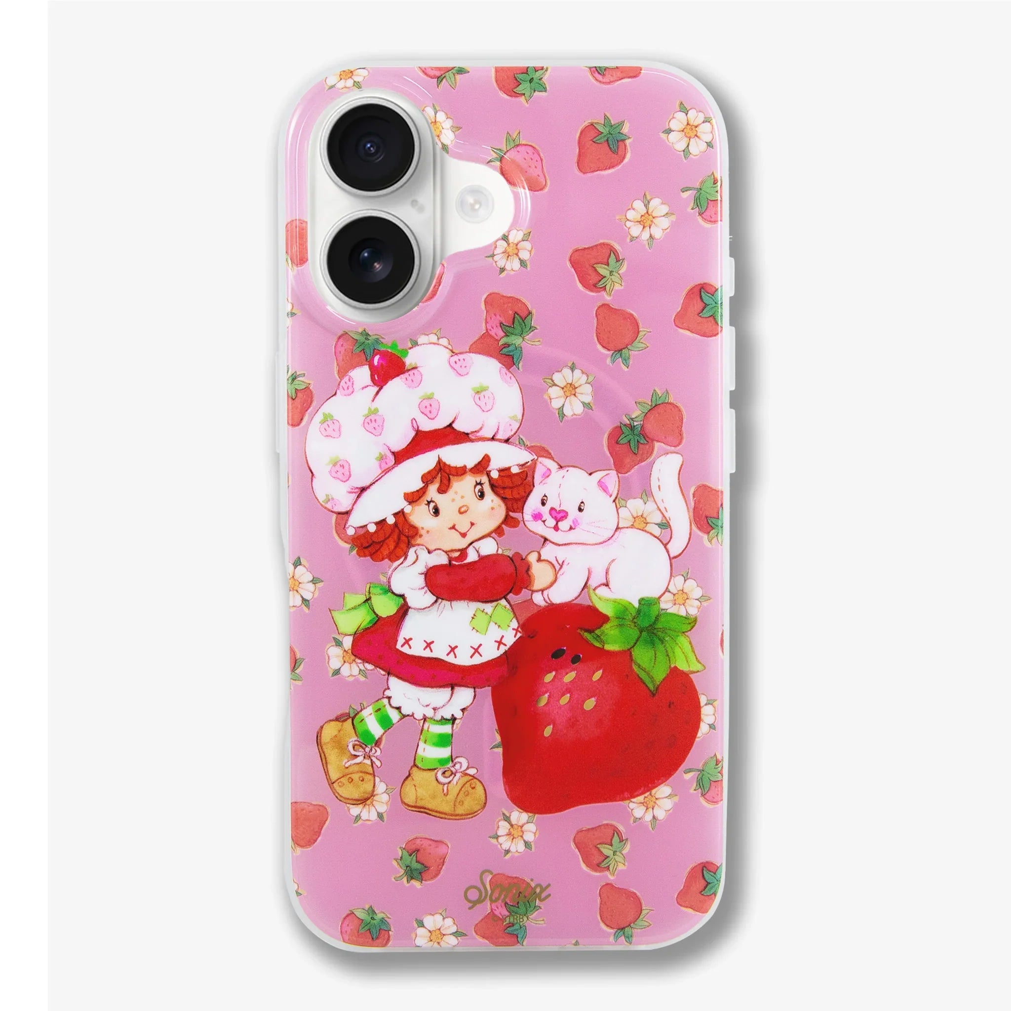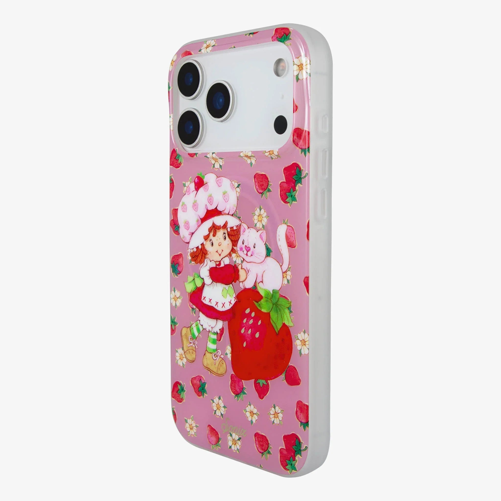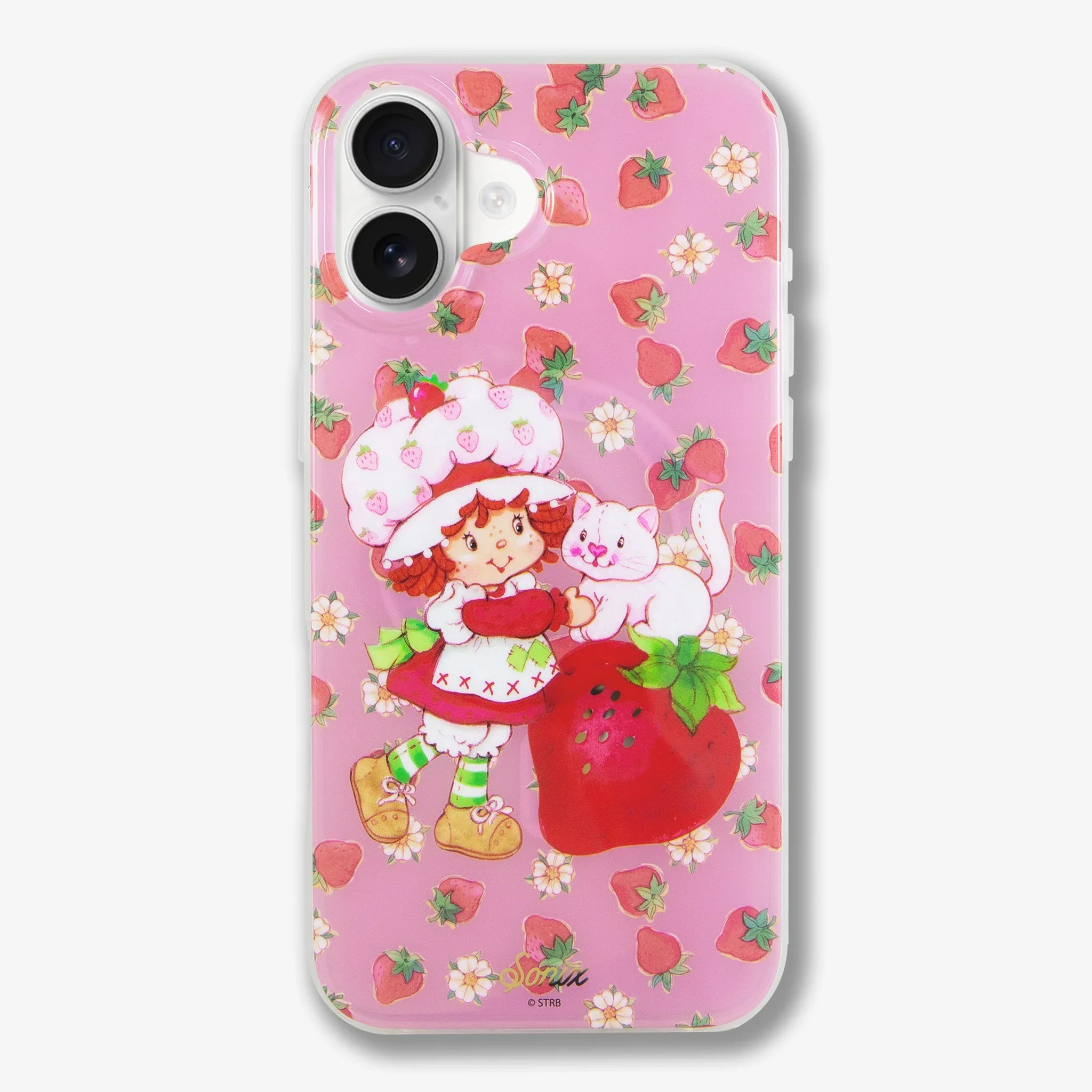 This charming, exclusive Sonix x Strawberry Shortcake™ iPhone case features Strawberry Shortcake™ and her pet cat, Custard. The vintage art showcases Strawberry Shortcake™ wearing her classic red dress, white pinafore, and pink strawberry bonnet. Juicy red strawberries and white flowers are sprinkled about the background of this berry pink jelly case. Sweeten your daily carry with this berry cute MagSafe® compatible iPhone case.